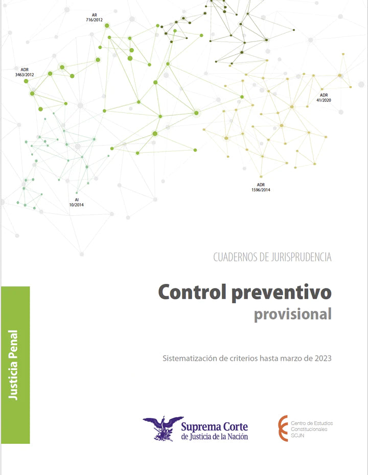 A través del presente cuaderno de jurisprudencia, el Centro de Estudios Constitucionales difunde el trabajo del Alto Tribunal para que el control preventivo provisional sea conocido por las personas que intervienen en el sistema jurídico en México, particularmente, quienes operan el sistema de justicia penal; es imprescindible que ellos conozcan los diversos aspectos de la figura del control preventivo provisional para evitar.