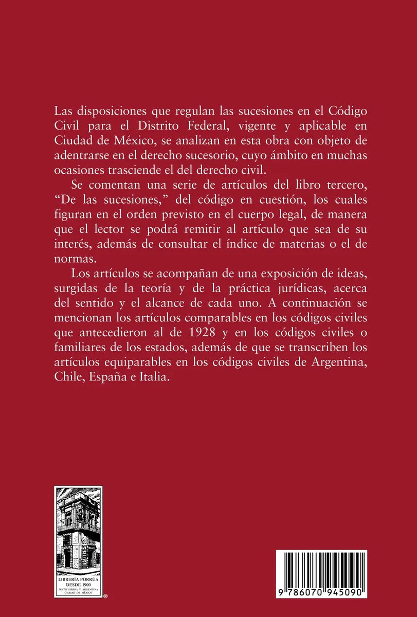 "Las disposiciones que regulan las sucesiones en el Código Civil para el Distrito Federal, vigente y aplicable en Ciudad de México, se analizan en esta obra con objeto de adentrarse en el derecho sucesorio, cuyo ámbito en muchas ocasiones trasciende el del derecho civil. Se comentan una serie de artículos...